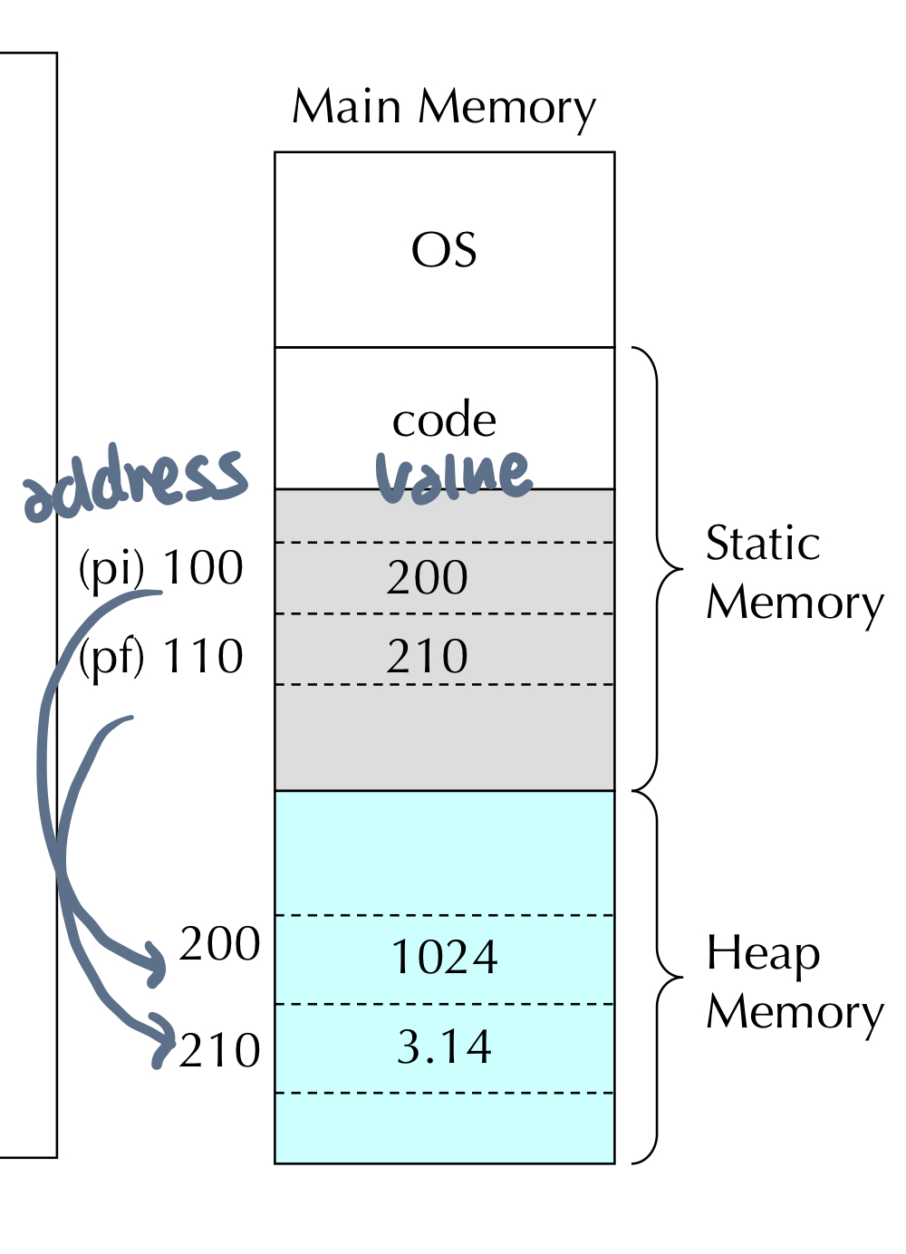처음 *pi와 *pf는 정적 메모리 공간에 할당되었다.