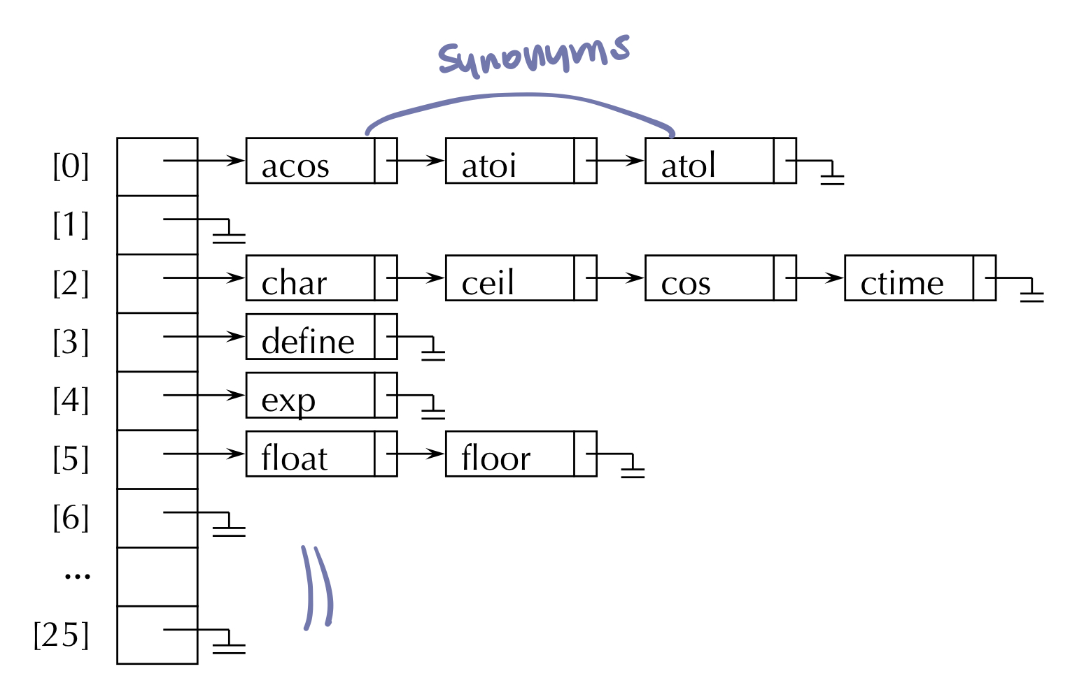 - 동의어(synonym) : 해시 테이블의 동일한 버켓 주소로 매핑된 서로 다른 명칭들, f(i₁) = f(i₂) 이면 i₁와 i₂는 동의어이다.