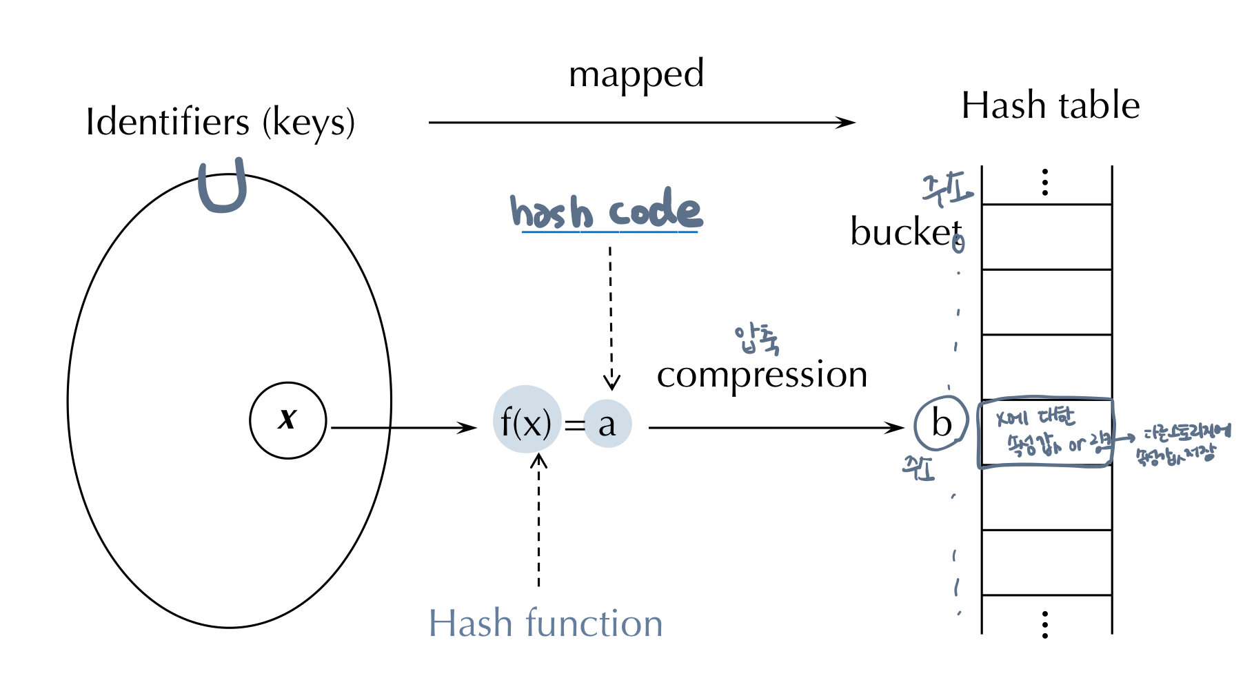 - 오버플로우 (overflow) : 명칭 i가 이미 꽉 찬 버켓으로 해싱(매핑)되는 경우 오버플로우가 발생한다고 말한다.