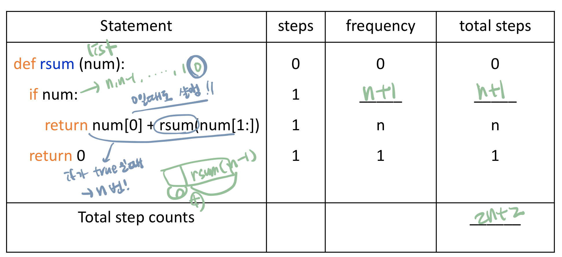 - variables, return address, n times funcion calls (rsum(n-1), ..., rsum(0))
