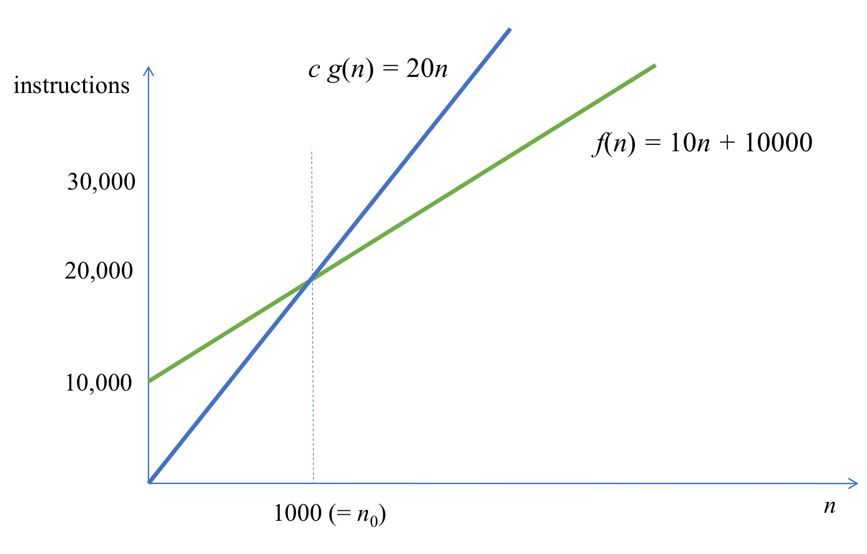 - f(n) ≤ 20n (=c) for all n ≥ 1000 (=n0)