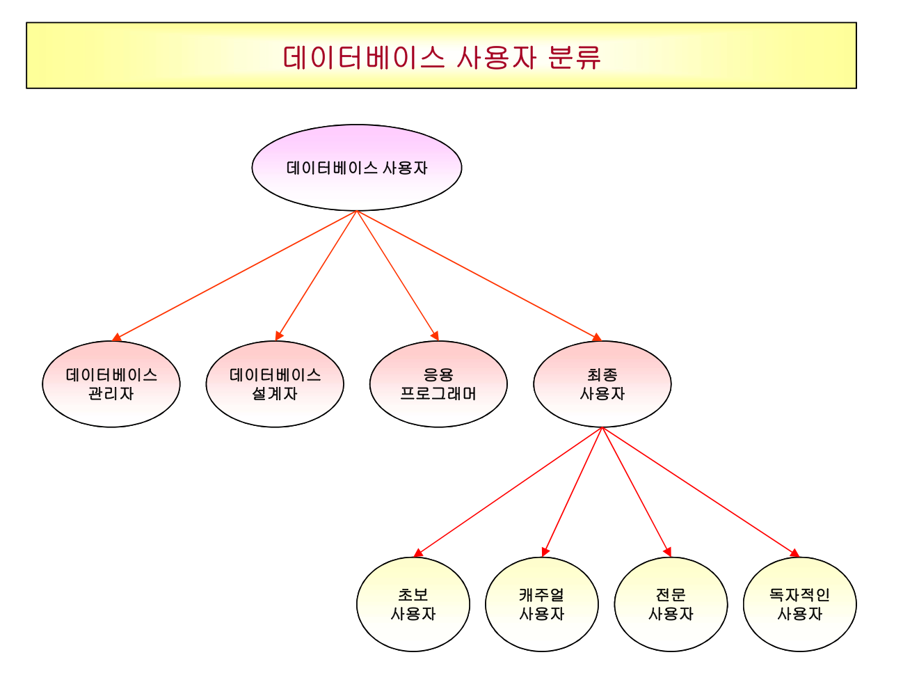 - Operators and maintenance person: 데이터베이스 시스템의 하드웨어 및 소프트웨어 환경 실행 및 유지 관리 작업