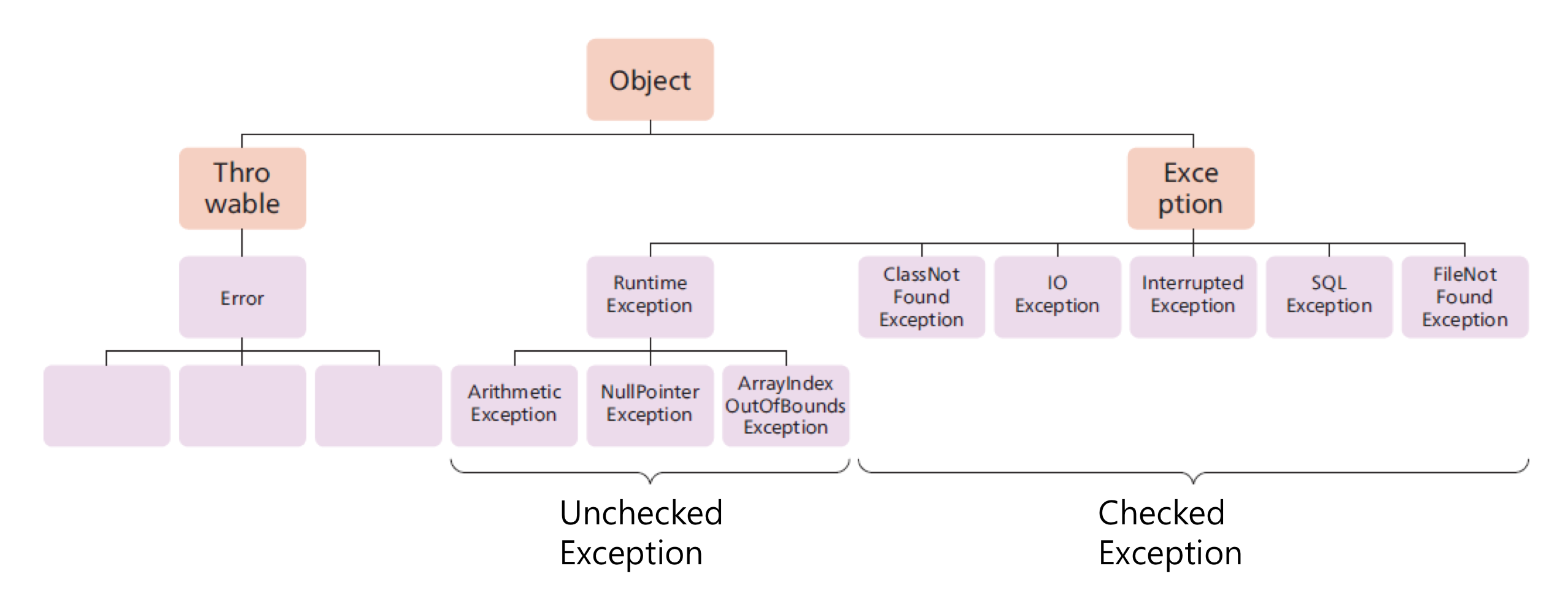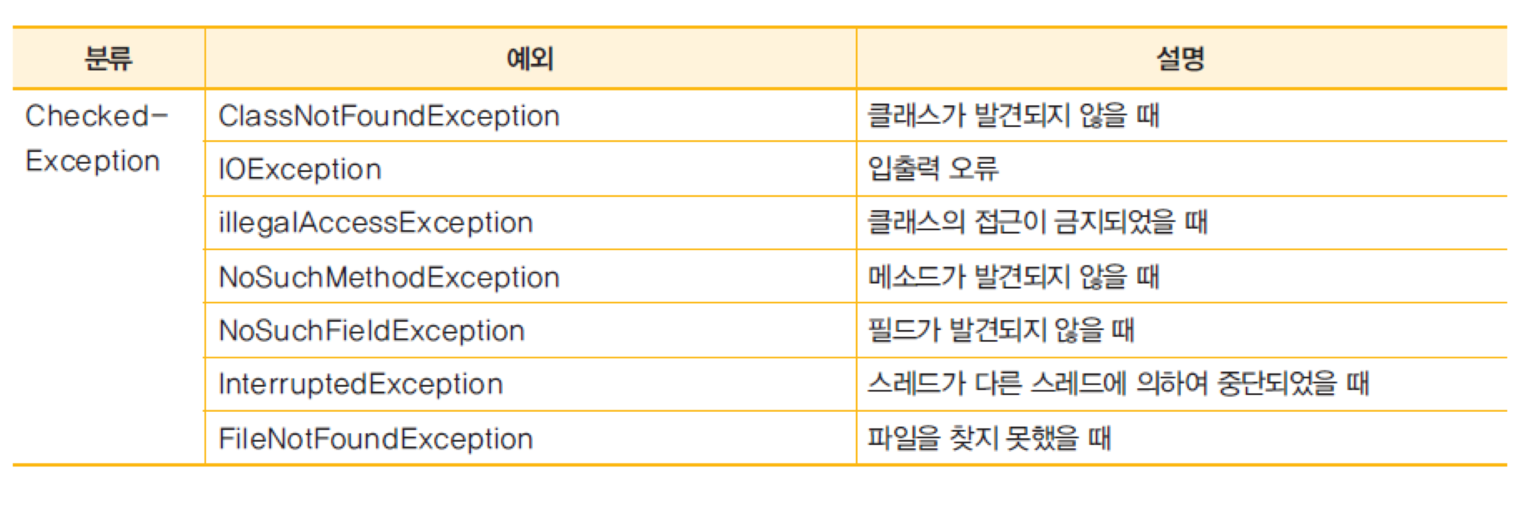 - Error나 RuntimeException이 아닌 예외 : 반드시 처리해야 함!! -> 검사
