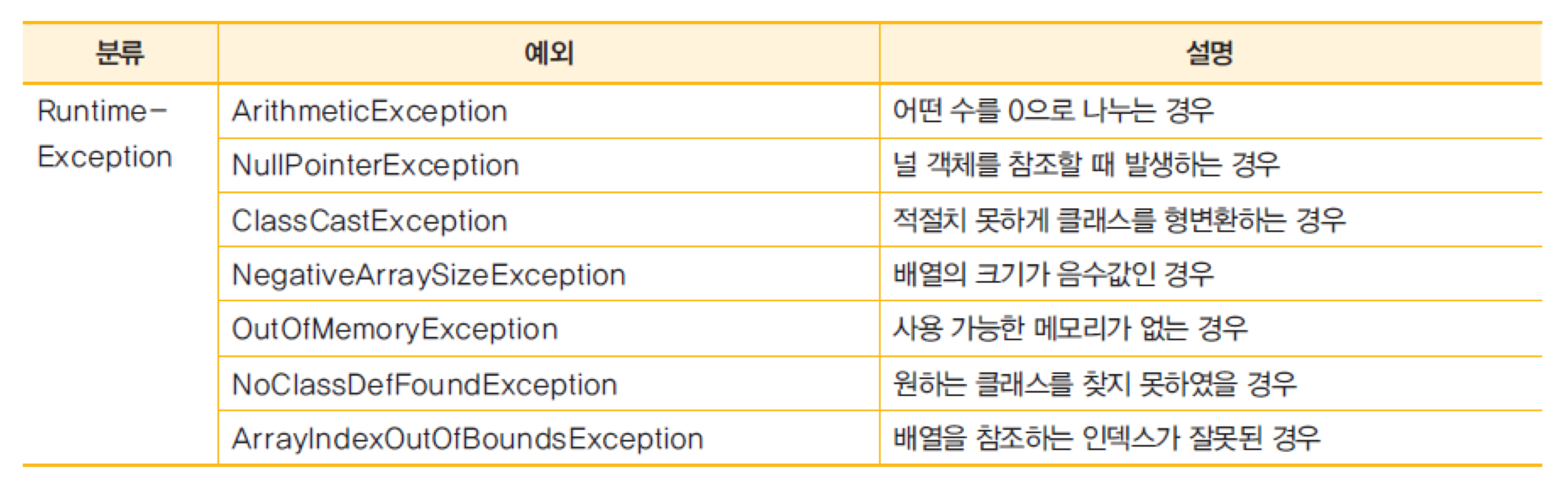- 예외: 잘못된 코드, 부정확한 데이터, 예외적인 상황에 의해 발생하는 오류