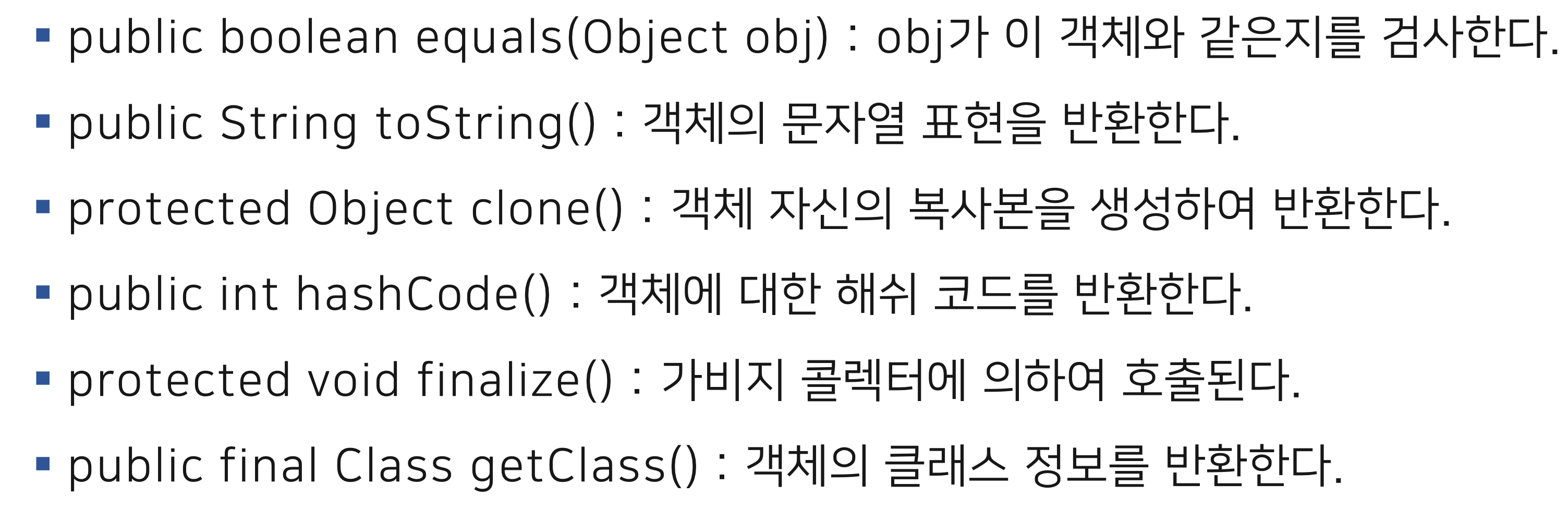 - 자바 클래스 계층 구조에서 맨 위에 위치하는 클래스