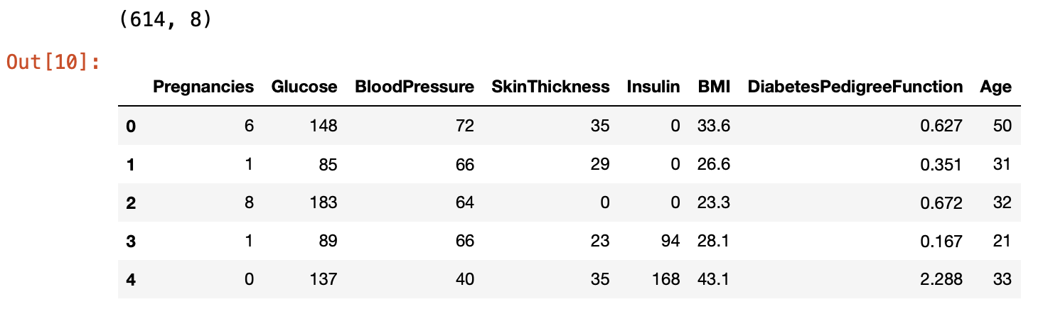 feature는 이렇게 9개가 있는데, 우리가 예측할 것은 마지막 컬럼인 outcome (당뇨병인지 아닌지) 이기 때문에 뒤에서 두번째 컬럼인 Age까지를 feature_names에 저장하고, 마지막 outcome을 label_name에 저장했다.